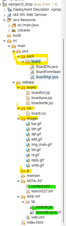 연두색 하이라이팅: context.xml은 드라이버 연동용. 롬복은 오버로딩용. 마리아디비자르는 디비용.