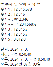 포맷팅 | 숫자,날짜,시간을 포맷팅 하는 기능과 국제화, 다국어 지원 기능을 제공한다. | fmt |