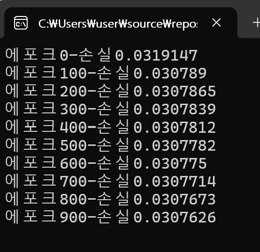 std::cout << "에포크" << epoch << "-손실" << totalLoss / x.size() << endl;