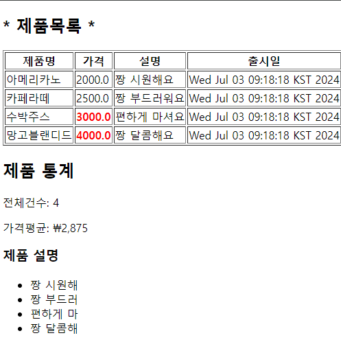 <th>제품명</th><th>가격</th><th>설명</th><th>출시일</th>