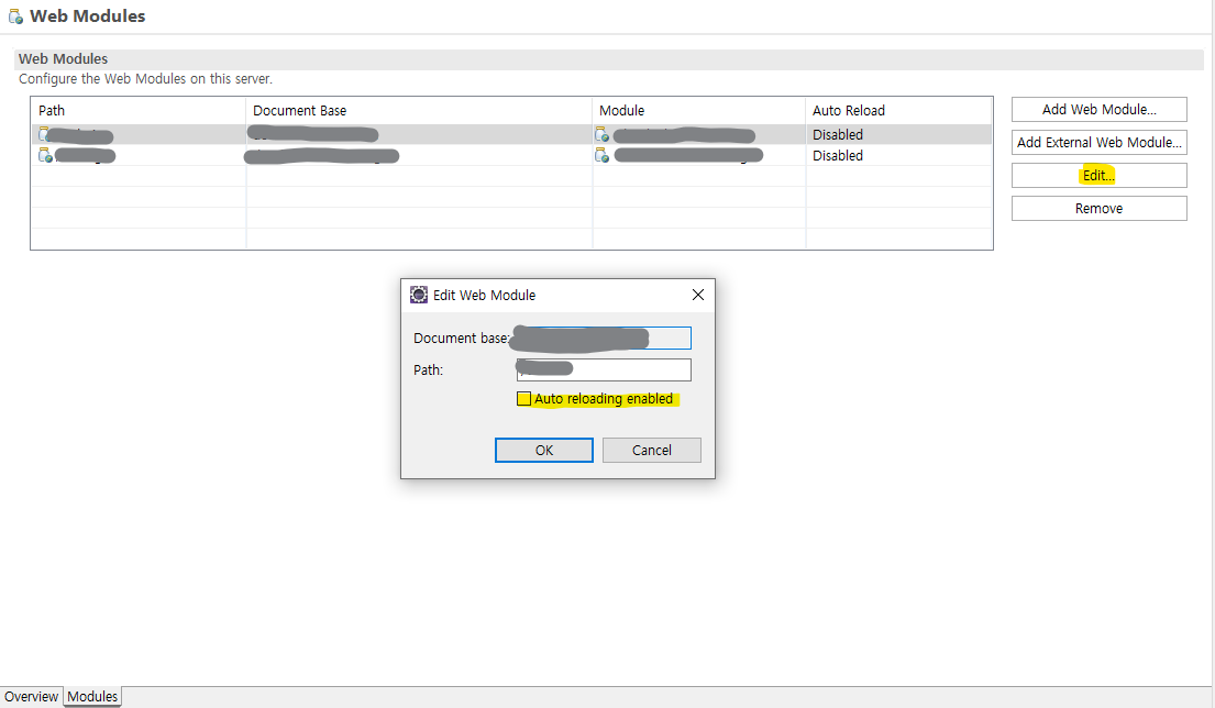 이를 위해서 해야하는건 아파치 서버 더블클릭 > Module 탭에서