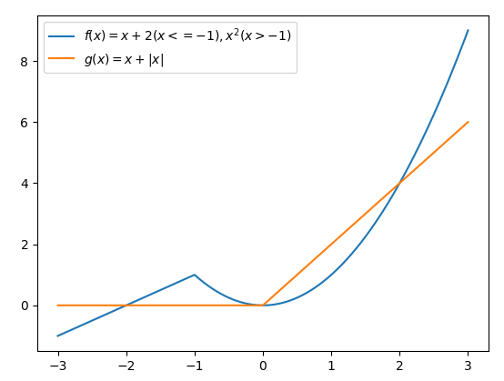 labels=(r'$f(x)= x+2(x<=-1), x^2(x>-1)$', r'$g(x)= x+|x|$'))
