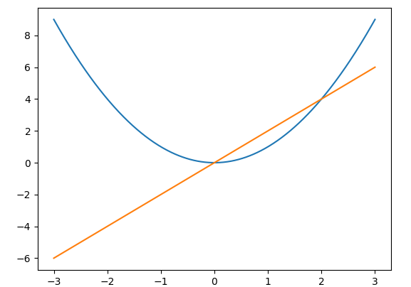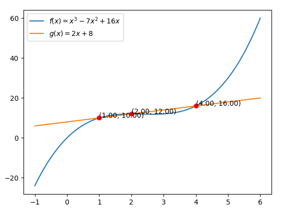 labels=(r'$f(x) = x^3 - 7x^2 + 16x$', r'$g(x) = 2x + 8$'))