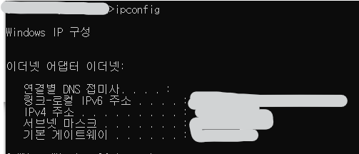 여기서 ipv4 주소가 개인 로컬 ip주소, 기본 게이트웨이가 공유기의 ip주소이다.