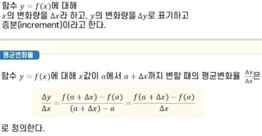 y=f((x))에서 미분 계수 f'((a)) 가 존재하면, 함수 y=f((x)) 는 x=a에서 미분가능 differentiable 하다고 한다. 그리고 그 함수는 x=a에서 연속이다.