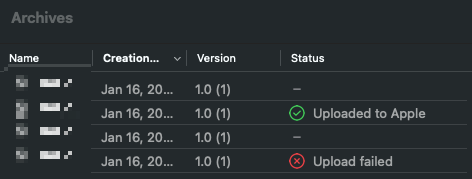 성공적으로 되면 status 에 체크표시와 함께 uploaded to Apple이라고 뜬다.