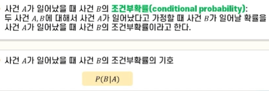 조건부 확률은 어떤 사건이 일어날 확률이 다른 사건이 일어날 확률에 영향을 받는 것을 고려한 확률.