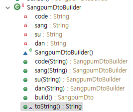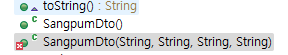 해당 어노테이션작업을 통해, outline에서 기본생성자 SangpumDto(), 모든 파라미터를 포함한 생성자 SangpumDto(----) 가 생성되었음을 확인할 수 있다.