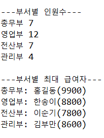 + "where (buser_num, jikwon_pay) in (select buser_num, max(jikwon_pay) from jikwon group by buser_num)")