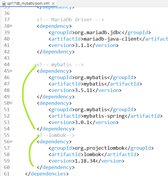 mybatis 연동 작업을 위해, pom.xml에 mybatis 소스코드를 추가한다.
