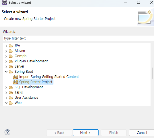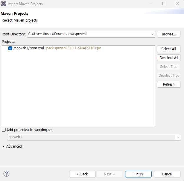 이런 루트로 최종적으로 이클립스에 해당 프로젝트(sprweb1)이 생성된다.