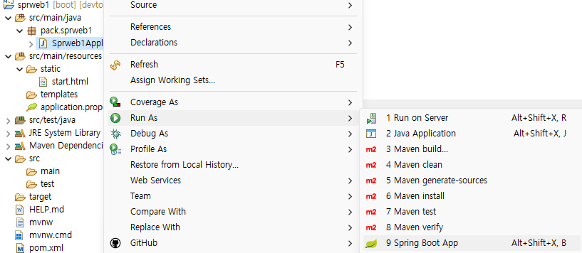 해당 프로젝트에서 혹은 java 패키지에 Sprweb1Application.java(이게 일종의 출력용 메인.java)에서 run as 를 수행한다.