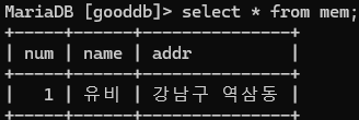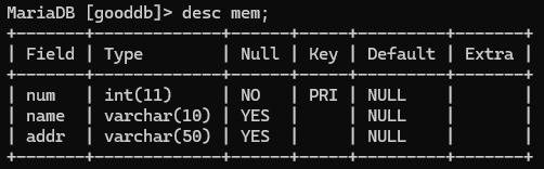 create table mem (num int(11) primary key, name varchar(10), addr varchar(50));