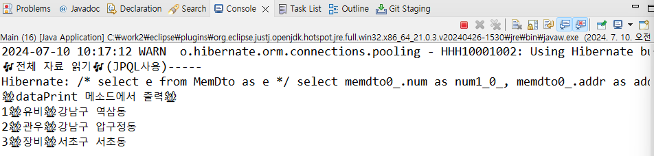 SQL문 : select memdto0_.num as num1_0_, memdto0_.addr as addr2_0_, memdto0_.name as name3_0_ from mem memdto0_ where memdto0_.addr like ?