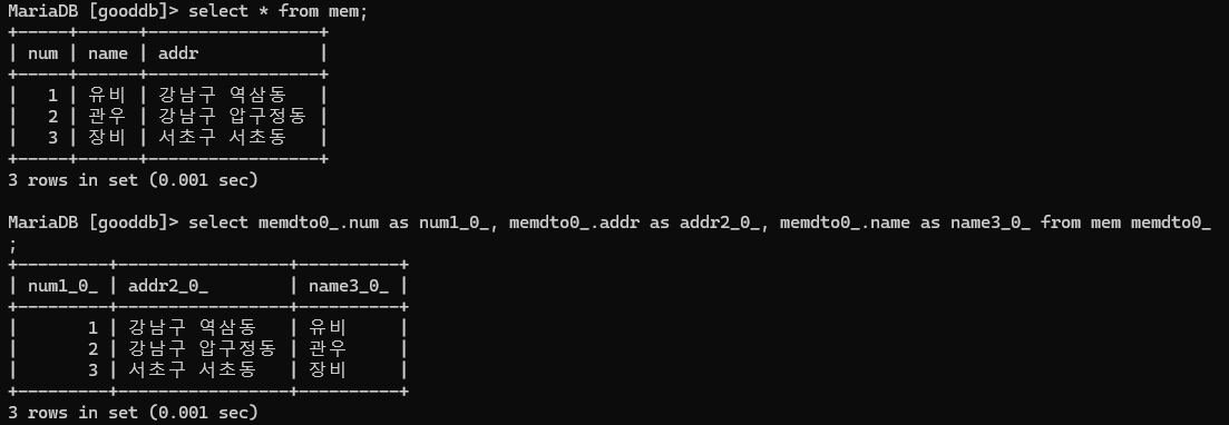 Hibernate: select memdto0_.num as num1_0_0_, memdto0_.addr as addr2_0_0_, memdto0_.name as name3_0_0_ from mem memdto0_ where memdto0_.num=?