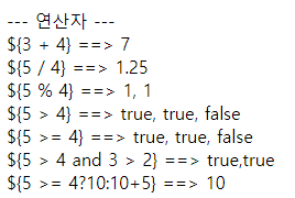 \${5 > 4 and 3 > 2} ==> ${5 > 4 and 3 > 2},${5 > 4 or 3 > 2} <br><!-- 관계연산자 -->