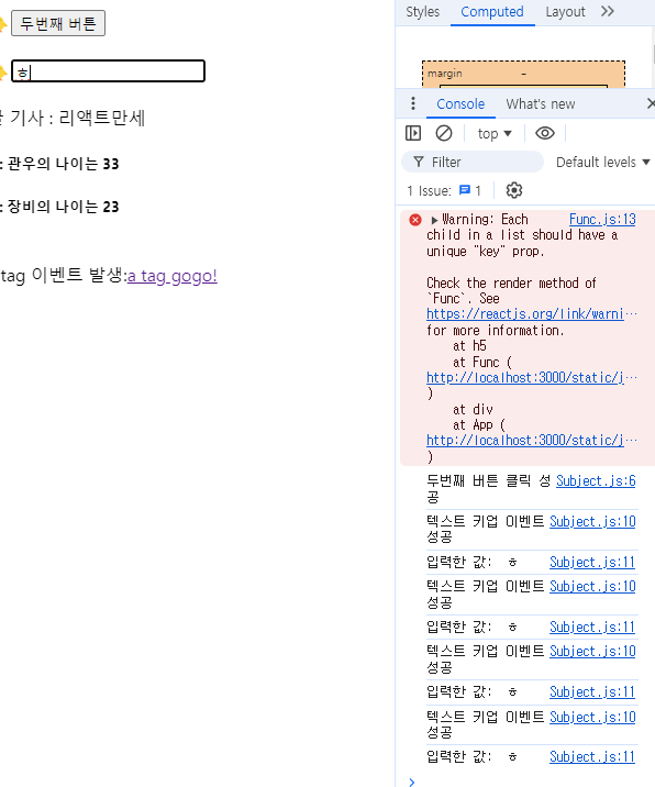 두번째버튼을 누를때마다 콘솔창에 "두번째 버튼 클릭 성공"이 찍히는걸 볼 수 있다.