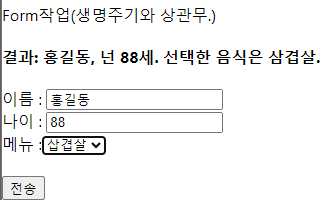 결과: {formData.irum}, 넌 {formData.nai}세. 선택한 음식은 {formData.menu}.