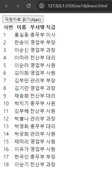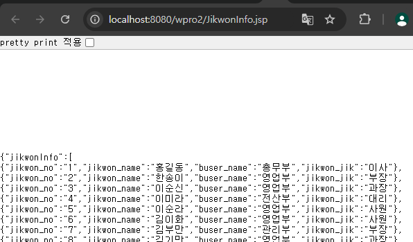 Access to fetch at 'http://localhost:8080/wpro2/JikwonInfo.jsp' from origin 'http://127.0.0.1:5500' has been blocked by CORS policy: No 'Access-Control-Allow-Origin' header is present on the requested resource. If an opaque response serves your needs, set the request's mode to 'no-cors' to fetch the resource with CORS disabled