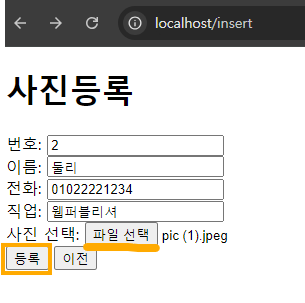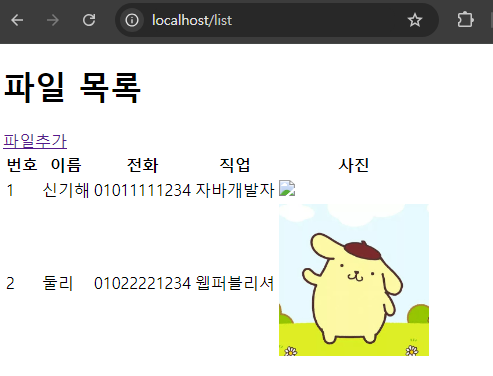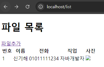 <th>번호</th><th>이름</th><th>전화</th><th>직업</th><th>사진</th>