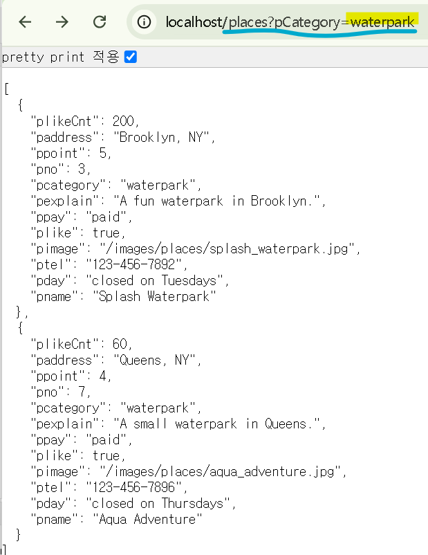 - /places?pCategory=aa는 pCategory라는 쿼리 파라미터를 사용하여, 카테고리에 따라 필터링된 장소들을 가져오는 API입니다.