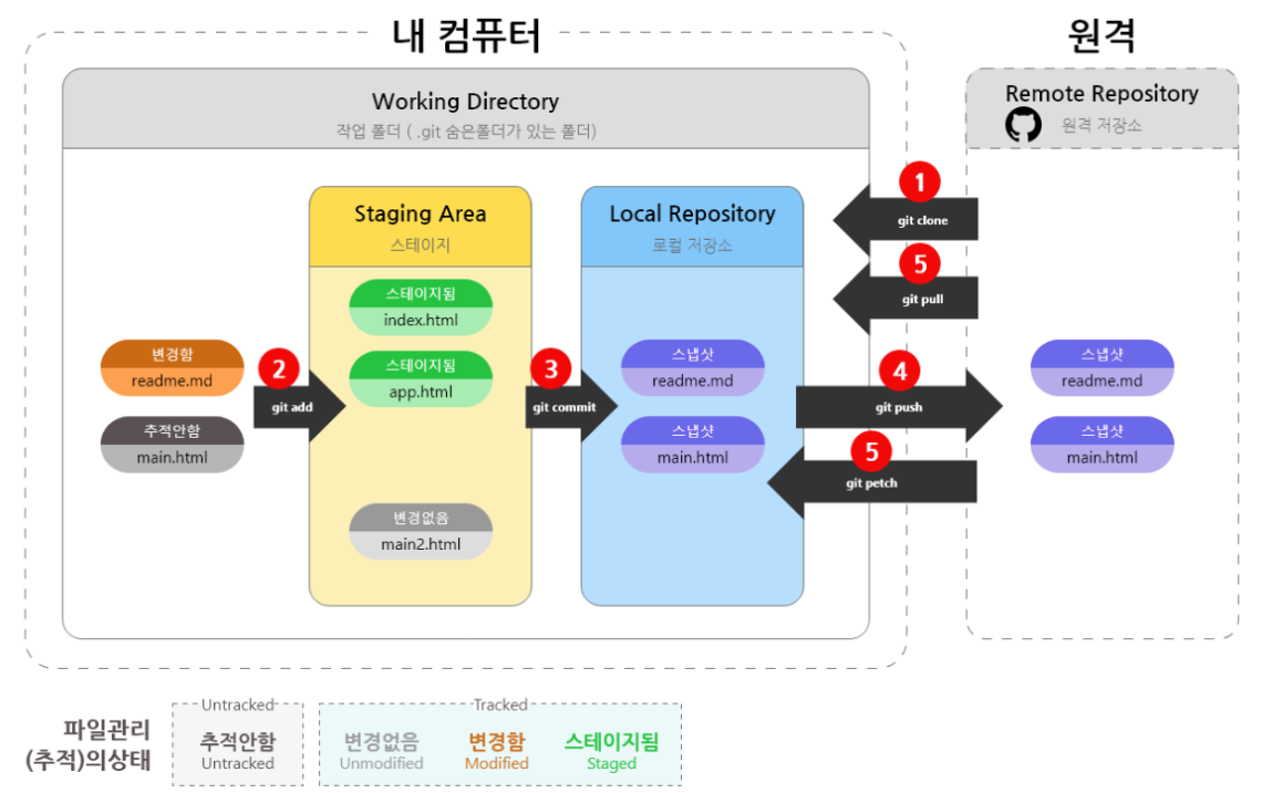 원격저장소(깃)에서 최신 작업물을 > 내 작업공간(로컬저장소)로 당겨온다 : pull