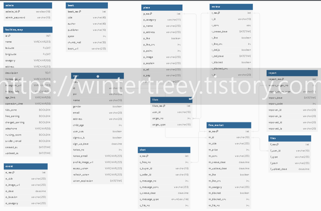 대부분의 테이블 no에 pk를 주었고, 연관되는 테이블의 칼럼들을 일대다 관계로 까마귀발모양으로 엮어두었다.