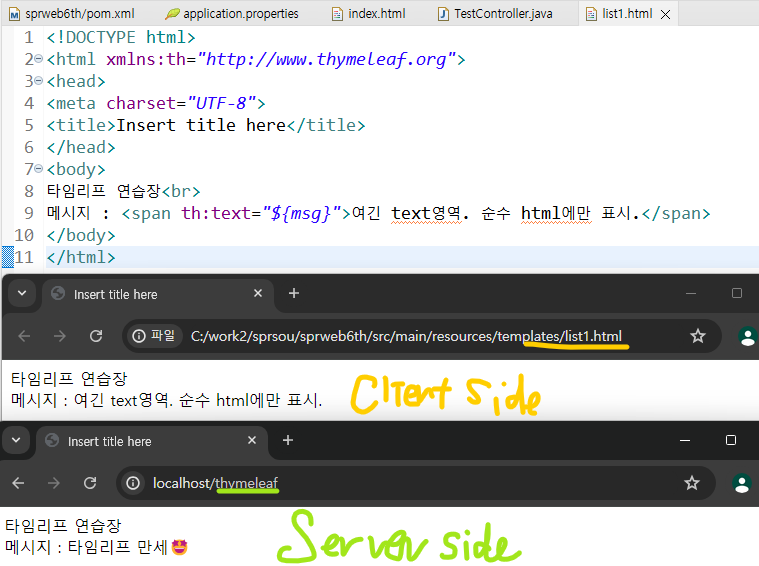 메시지 : <span th:text="${msg}">여긴 text영역. 순수 html에만 표시.</span><br>